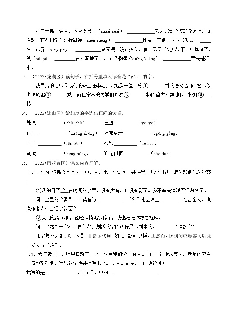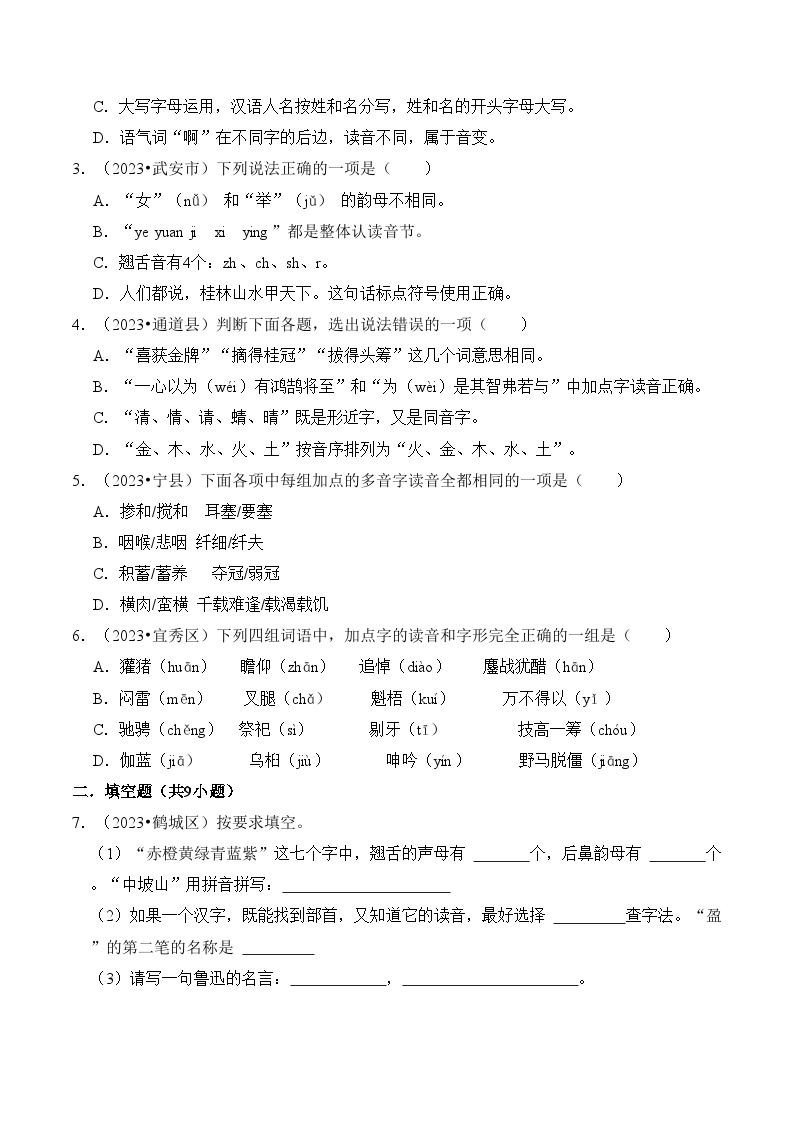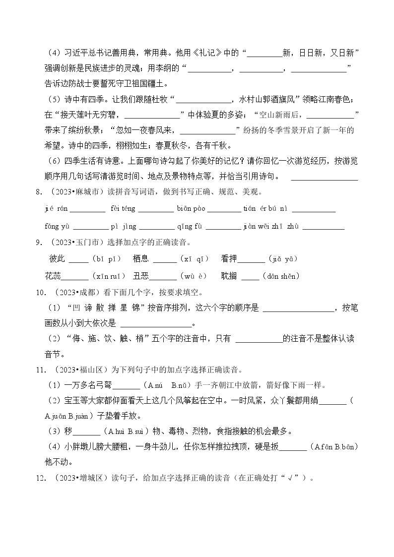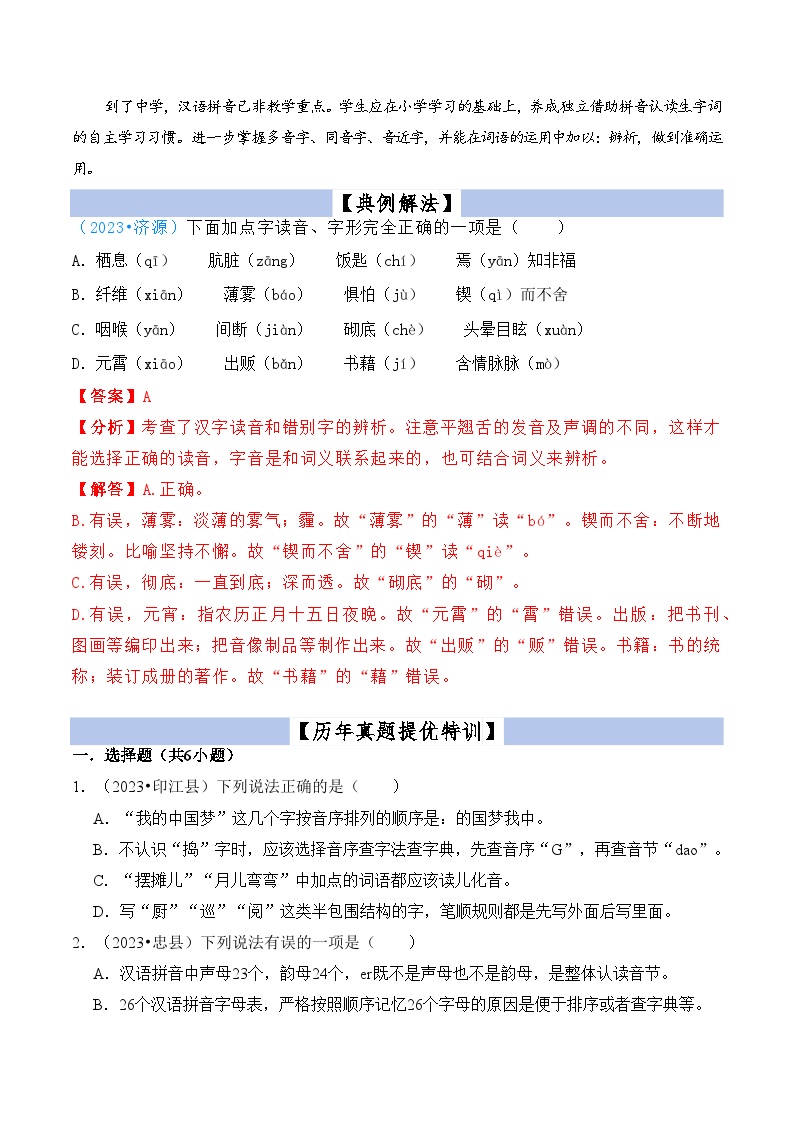 【小升初语文真题】专题01++拼音-2024小升初语文专项复习