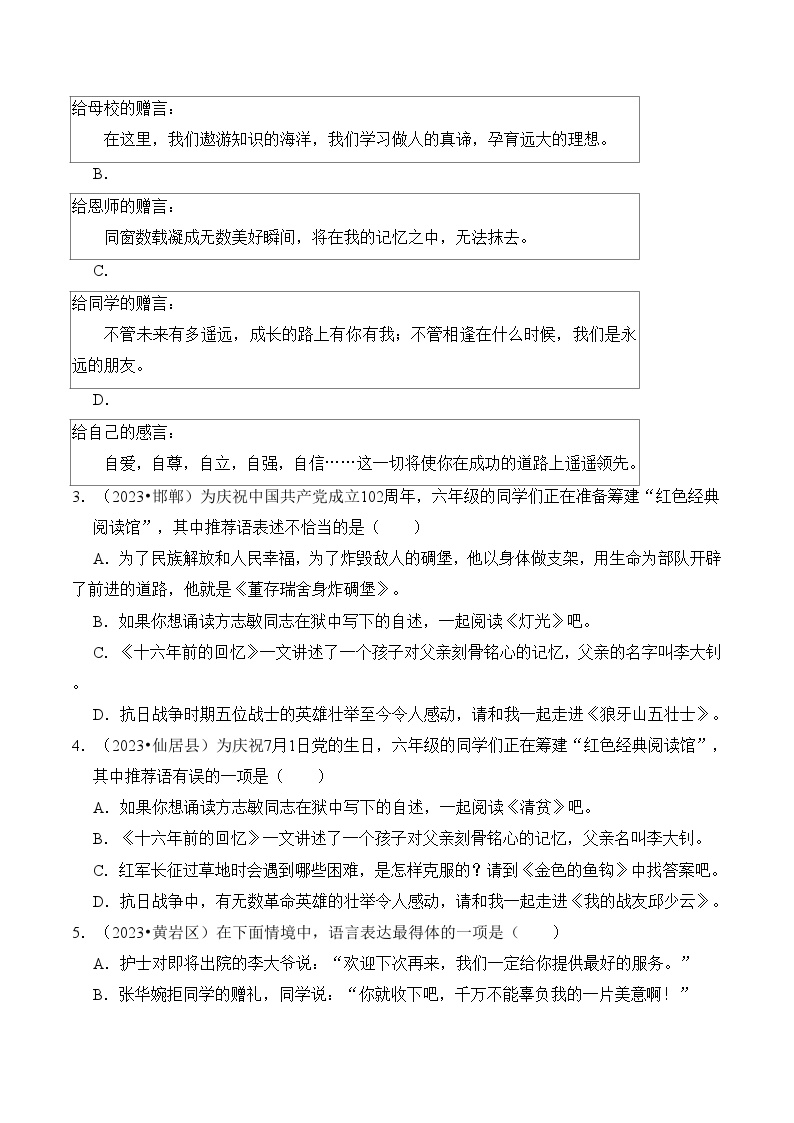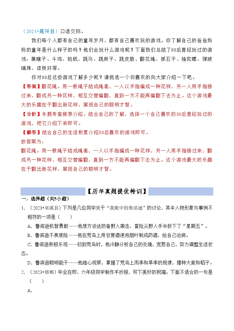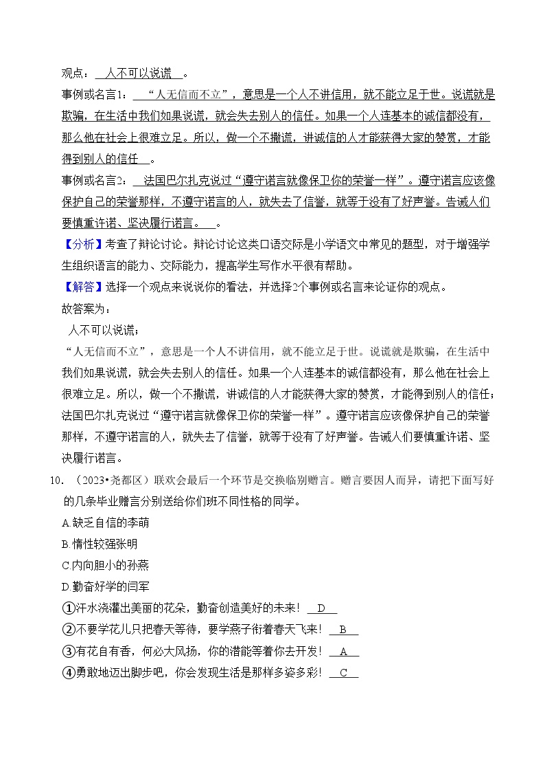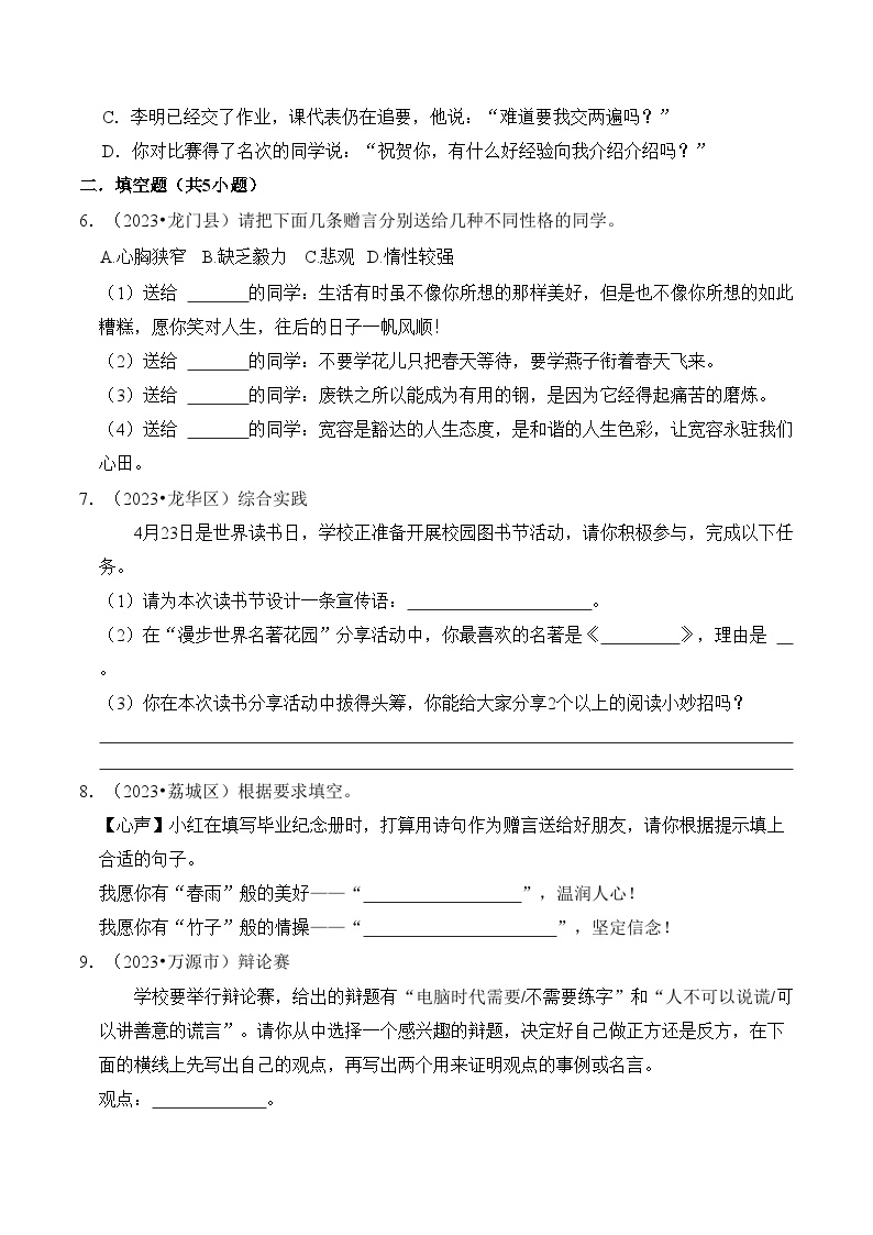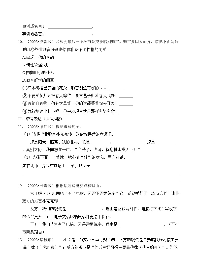 【小升初语文真题】专题14++口语交际-2024小升初语文专项复习